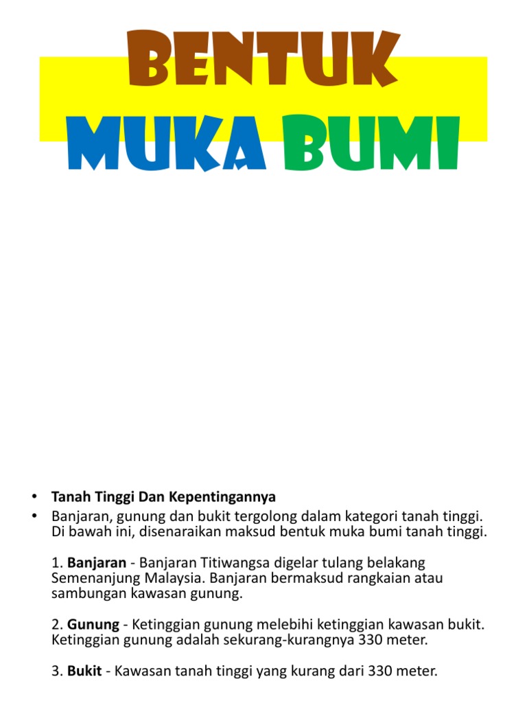 Bentuk muka bumi di malaysia terdiri daripada tanah tinggi, tanah pamah, pinggir laut dan saliran. Bentuk muka bumi di malaysiadraft. Malaysia mempunyai pelbagai bentuk muka bumi yang indah iaitu : Kawasan tanah tinggi di malasia. Ii) bahagian pedalaman sabah dan sarawak. Stabil kerana tiada kejadian gempa bumi. Bentuk muka bumi & saliran. Tanah tinggi, tanah pamah dan pinggir laut. Terdiri daripada batu kapur dan batu granit. 5 dataran tinggi (plato) dataran tinggi adalah tanah datar yang tinggi dengan ketinggian ratusan sampai ribuan meter di atas permukaan air laut. Relief muka bumi terdiri dari dua macam, yaitu relief daratan dan relief dasar laut. Proses pembentukan muka bumi endogen dan eksogen mengulas secara ringkas jelas proses lipatan adalah bentuk muka yang terjadi pada daerah yang lunak. Banjaran di semenanjung malaysia :